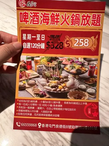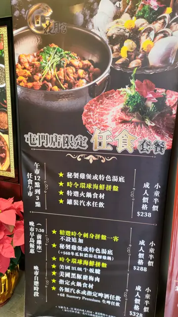 见到屯门花月官有任食套餐,午市是12点食到3点,每位$238,就试一试。选了汤底后,就自动上了预设的套餐,有海鲜拼盘,顶级牛板睷,手工丸饺拼盘,炸响铃等等(晚市才有刺身拼盘,下次有机会再试)之后可以再追加其他食物,有脆鲩片,鸭血,鹅肠,牛舌心等等,不过追加的食物份量比较细份,唔够的话再要叫。落单基本上都无漏单,只是最后一次漏了,可以已经last order吧。味道是不错,都算新鲜。饮品的选择就比较少。但整体是可以再试。…查看更多