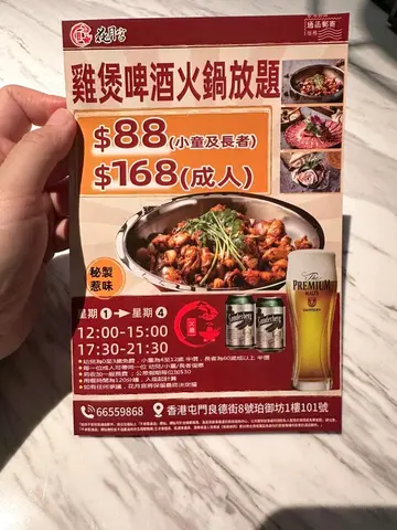 火锅任食有两个餐可选,都是两小时,贵的$258 有刺身海鲜靓d既牛,平的鸡煲火锅$168 ,小童$88,只限星期一至四晚上,两大一小,谂住平平地选$168试下先,一入到坐好,有三碟小食先上,青瓜云耳算正常,饺子春卷淋晒,我个仔平时最钟意食脆口野见到都唔食,另外有碟好像是桂花糕,无乜味一般般。之后鸡煲叫咗小辣,个汁好稀,鸡无味,平时最钟意食鸡嘅我都已经好低要求,但都觉得唔系好掂,成盘食咗一半左右之后就唔要,之后要直接用番鸡煲个煲加汤打边炉,d汤有浸怪味咸咸地。之后嗌咗啲肥牛丸类牛舌脆鲩鹅肠,啲嘢食一上枱,我同我老婆都呆咗,肥牛喺街市买最cheap最cheap𠮶只,色泽暗沉,劲唔新鲜,好似d雪左好耐既货脆鲩完全无鱼味,蟹柳系一嚿粉𠮶只,牛舌鹅肠都系完全唔掂连公仔面乌冬都唔好食,都唔知咩嚟最后叫咗唐生菜,勉强算可以食到好灰,灰到已经唔记得影相,完全唔饱,d野基本食唔落口,好耐无食过咁难食既一餐,虽然话三个人两大一小任食火锅四百几蚊算系平,但都唔使差成咁呀话,唯一饮品算正常,但种类不多,唯有饮多d 野