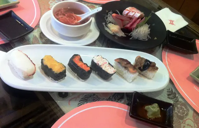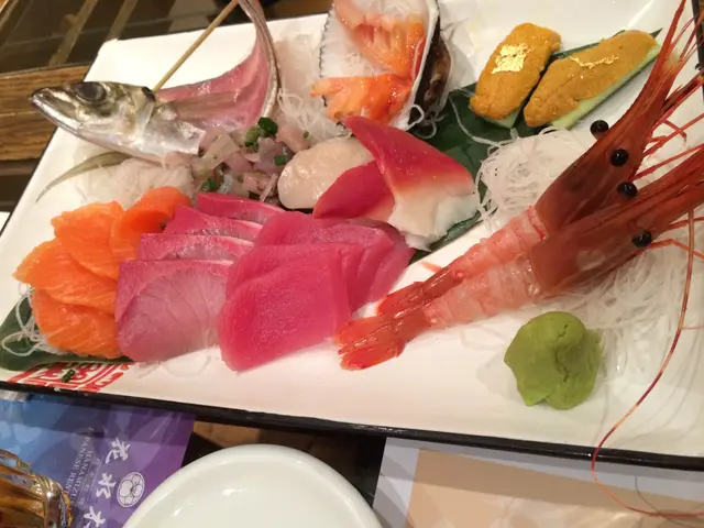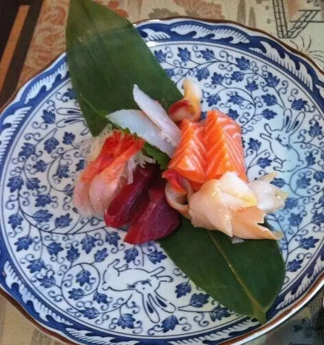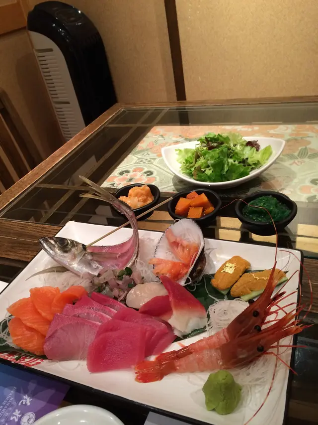 為左完善表弟既增肥大計,我地黎左花水木食富貴放題,唔使同人迫呀嘛!酒店送出既豪華刺身拼盤: 秋刀魚刺身有D似咸魚, 但肉質爽脆, 口感特別大海膽有D令人失望,好耐冇係香港食過令人滿意既海膽了...三文魚, 吞拿魚,甜蝦質素一般...切得不厚, 魚香亦不算突出大海赤蝦件頭較大, 出奇地彈牙幼滑,很讚