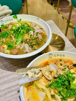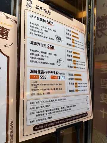 呢几日见社交平台元朗谷好多人介绍花甲先生,心血来潮就去揾下佢,晏昼两点来到排晒队,目测等十张枱😂果断放弃😂五点几再来过,情况好好多等两张就有得入座。店舖唔大,大概三十个位左右。餐牌除左花甲粉,仲有几款辣味饭同数款小食,算系唔少选择。先扫码落单,介面有啲难用😅原来系先拣汤底再拣配撘,不过店员都好主动帮手落单嘅。⭐蒜香海鲜盛会花甲粉家人点了花甲先生的招牌粉海鲜盛会,是日海鲜有元贝、台山蚝、鱿鱼、虾同蛏子,听店员讲话某啲食材如果无货就会转。汤底要左蒜香口味,再配了公仔面。又真系几鲜甜,份量对得住价钱,唔错唔错😋⭐麻辣先生粉自己就拣左麻辣汤底,要左小麻小辣,实际上都几辣㗎,唔小啰,哈哈😝𩠌就点左牛丸、午餐肉、萝卜再加花甲,再叫左多芫荽。卖相吸引🤤虽然辣左啲但都几啱口味,乌冬好滑,花甲鲜味,正。⭐南乳鸡翼 & ⭐鸡皮饺子见枱枱客都加生炸鸡翼,我地又叫返份先,唉唉……卖晒啦🥲改叫南乳鸡翼,都正㖞,又香又脆仲带南乳香。除左鸡翼,仲加左鸡皮饺子,鸡油甘香又脆口,正🤤⭐日本豆乳红豆冰 & ⭐冻利宾纳饮品方面好多得拣,家人拣左红豆冰😆呢杯红豆冰有特别㗎,用上日本豆乳,再拣左少甜,哗哗,又真系几好饮,红豆好绵豆乳香甜,正。自己点左冻利宾纳,解辣一流👍系几好味,谷友无介绍错😝…查看更多