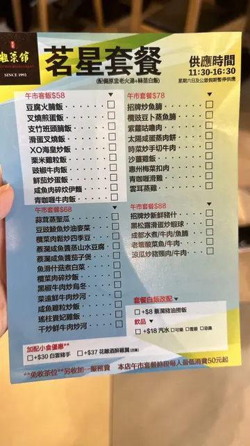 今日自己一个食晏,谂住简简单单食个饭就算,于是就行到嚟佐敦嘅粗菜茗星馆,之前食过都觉得几抵食,有茶有汤有饭都系五十几蚊起,加埋一都系六十零蚊相比晚餐实在性价比太高了👍🏻食得清清地,就拣咗个豆腐火腩饭食虽然50几蚊,但系绝不欺场六七件火腩+六七件炸豆腐,再加一碗大大碗嘅饭,同热辣辣嘅例汤差啲食唔晒🤭本人对汤10分执着,一定要热辣辣先饮,所以呢度就绝对啱晒口味,佢啲汤拎出嚟系热到辣嘴嘅程度,大爱❤️…查看更多