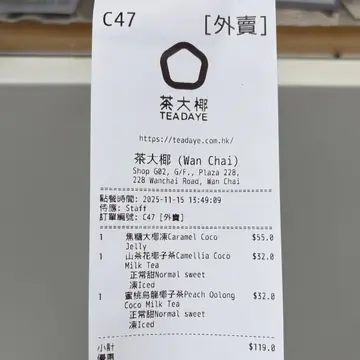 茶大椰 (湾仔) 网址: https://s.openrice.com/QrLS0ib8F00 地址: 香港灣仔灣仔道228號Plaza 228地下G02號舖 电话: +852 93907331