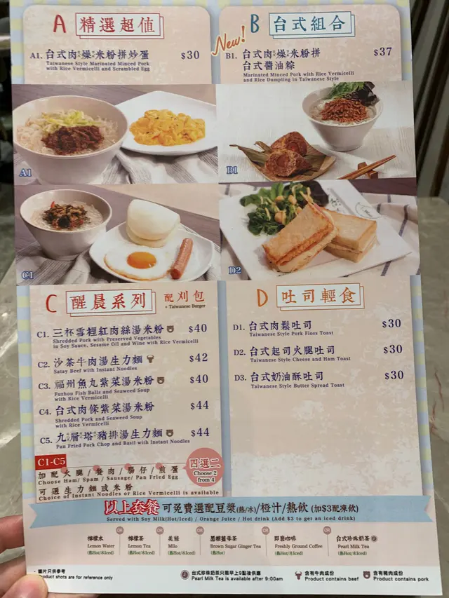 平常幫襯茶木都喺午餐或晚餐,估唔到佢哋連早餐都有台式風味,一於試下。雖然唔使停位,但內裡都都差不多滿座 早餐分為4類,共10款可供選擇。1. A 精選早餐( 台式肉燥米粉拼炒蛋連熱飲($30),肉燥味濃,但份糧略為較少,而米粉如可以轉為更幼細的新竹米粉會更佳。炒蛋夠滑,有蛋香味2. C 醒神系列 (沙茶牛肉湯生力麵配刈包,火腿、餐肉、腸仔、煎蛋可4選2,配熱飲)($40)。沙茶牛肉味濃,肉質夠腍,但份糧同樣較少,另外原湯底較為清淡。煎蛋、腸仔同刈包都無特別。整體來講,店內環境舒適,早餐價錢實惠,A餐只需$30 確係抵食之選查看更多