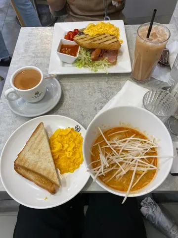 呢个礼拜食左2次,因为味道,份量及价钱,都十分合理。食品结合cafe和茶餐厅menu, 但真材实料,好味道过茶餐厅10倍!奶茶的味道,我也喜欢。店内地方清洁,台上面d 用具,也feel 到较干净。有一次中午去吃lunch, 见到其中一张枱有1位厨房员工及1位前线员工在吃lunch,觉得小店很好,就算peak hour 都放弃一张枱揾钱,安排员工好好坐下食饭,可能他们已经忙了一整天早上的早餐时段。上次我吃左牛柳丝炒意粉🤪好味~今日同家人食左沙爹牛肉公仔面,炒旦,丹麦酥,家人吃了比目鱼饭👍👍希望这用心制作的小店一直生存下去~