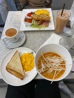 呢间店既加央多士加炒蛋及喇沙套餐送一杯热奶茶。个加央多士好香脆,啲酱好多,好有加央味。炒奶系牛乳炒蛋,香滑有蛋味。喇沙面有好多配料,芽菜,豆卜,鸡肉等等,香椰得嚟面都有咬口,偏辣。奶茶好香滑。