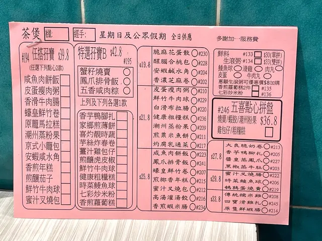 又是一個懶洋洋的星期天。看完兩個小時的早場電影已經下午一點,開始肚餓。於是到附近看看有什麼好吃醫肚。茶煲於將軍澳寶林商場。從地鐵站一出不用10分鐘便到,十分方便。 這裏的裝修簡單,而且寬敞,枱與枱之間有足夠距離,坐得舒服。 我們一行二人叫了幾樣點心一起分享。 高湯灌湯餃(⭐⭐⭐⭐⭐)灌湯餃皮薄,餡料豐富,包括了豬肉、蟹柳等等,配上濃郁的高湯,十分值得推介。蟹籽燒賣(⭐⭐⭐⭐⭐)燒賣太大粒,而且海蝦大隻彈牙,性價比極高。水晶蝦餃(⭐⭐⭐⭐⭐)蝦餃皮薄很靚,令人停不了口。煎粟米魚餅(⭐⭐⭐⭐⭐)魚肉彈牙,而且配上粟米粒,味道層次更為豐富。腐乳通菜(⭐⭐⭐⭐⭐)通菜份量多,而且吃起來嫩口。粗糧糕(⭐⭐⭐⭐⭐)粗糧糕十分香軟,也值得一試。脆奶卷(⭐⭐⭐⭐⭐)脆奶卷一向比較少有,吃起來外表香口,裏面有香軟的奶糕,口感嫩滑。四寶滑雞扎(⭐⭐⭐⭐⭐)四寶雞扎是我們的至愛,雞肉爽滑可口。鮮蝦腸(⭐⭐⭐⭐⭐)蝦腸即叫即製,上桌還是熱辣辣,皮薄餡靓,吃起來鮮嫩。芝麻卷(⭐⭐⭐⭐⭐)芝麻卷一份三條,芝麻味香濃,但不會太甜。總括而言,這間餐廳食物質素不錯,而且價錢十分大眾化。下次經過也一定會再來。 ~~~~~~~~~~~~~~~~~~~~~~~~ 茶煲 將軍澳寶琳寶琳北路18號寶林商場3樓1C號舖推介菜式:高湯灌湯餃 👍🏻地點方便👍🏻環境舒適 👍🏻價錢大眾 …查看更多