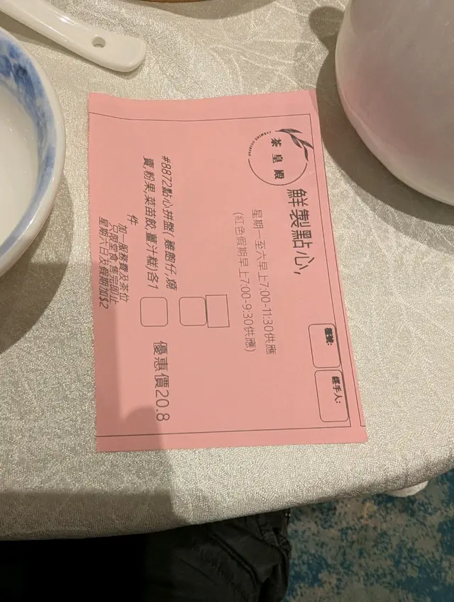 點一碟鳳爪加一個特惠拼盤。鳳爪醬汁不辣,但夠味既~菜苗餃個皮稍厚。整體點心普通,但見過價錢;山竹牛、鳳爪、叉燒包已經係大點30.8有點貴(地點屋村酒樓)特惠拼盤,廿蚊幾吸引。我閒日去,一支公加兩籠點心,承為六十一!^^起初比壺茶我,我一上手就覺得油立立。望真D,原來餸菜汁跡…於是叫待應…好快手同我換過壺…查看更多