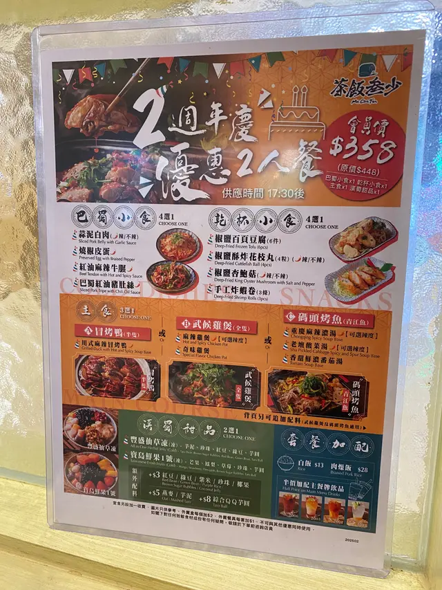 將軍澳最近新開左一間有得食雞煲,烤魚同埋糖水嘅中菜餐廳😍,所以同屋企人今日唞吓唔煮飯,落咗去食。😙餐牌上面嘅菜式種類都偏多,涼菜烤魚雞煲小炒糖水等等都有。仲有一人同二人套餐提供選擇。👍🏻⭐️晚市一人之境套餐 - 🐟豉汁蒸魚+手工蝦卷+烏龍茶這份套餐上枱時賣相整齊,豉汁蒸魚嘅魚肉軟嫩,帶有微微椒香。🍚用蒸魚豉油撈埋個白飯,啲飯都軟硬適中。⭐️手工蝦卷嘅皮很脆,🦐好味嘅不過可能因為跟餐追加嘅小食,所以份量就唔多。套餐還附送一杯熱烏龍茶,無糖去膩!😋⭐️手撕包菜🥗這道手撕包菜同樣值得一讚。包菜片片分明,保持爽脆,加上微辣乾椒和蒜蓉爆炒,油份適中,入口辣勁剛好,能帶出蔬菜的鮮甜。⭐️麻辣雞煲(半隻雞)-小辣🐓🌶️半隻雞嘅麻辣雞煲份量兩個人食啱啱好,賣相吸引。麻辣好香,辣就唔係好辣,所以鐘意食辣嘅可以叫🌶️中或者大辣。雞肉亦都十分嫩滑,攞嚟送飯都幾好。配料有蘿蔔,😋佢吸收麻辣湯汁後格外入味。因為得兩個人食,我哋都冇再追加其他配料了。總共$342再加一,份量其實夠三個人食,價錢都合理。適合多啲人一齊嚟食,咁就可以叫唔同種類嘅食物。…查看更多