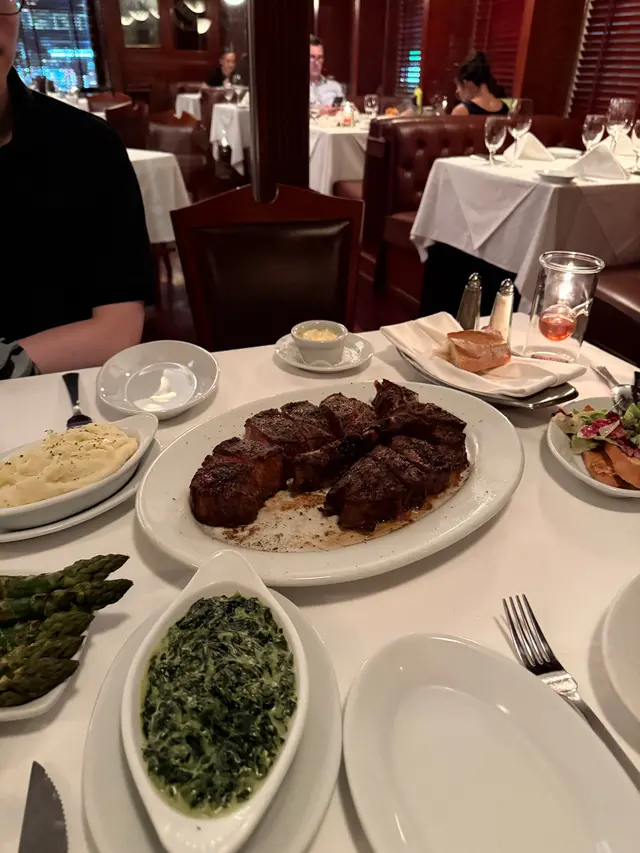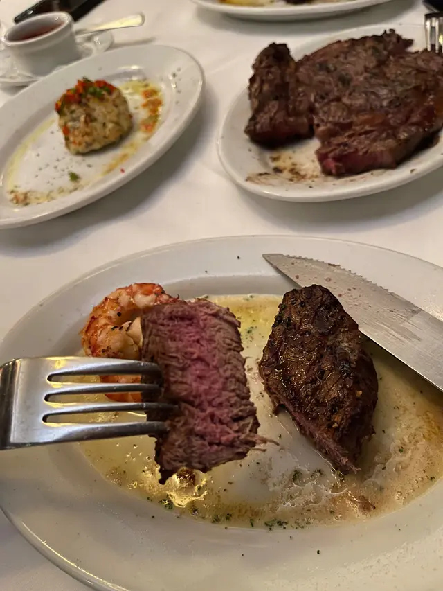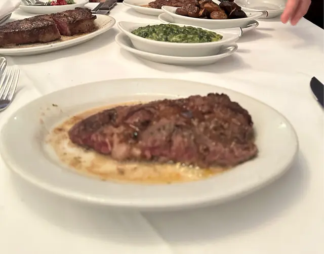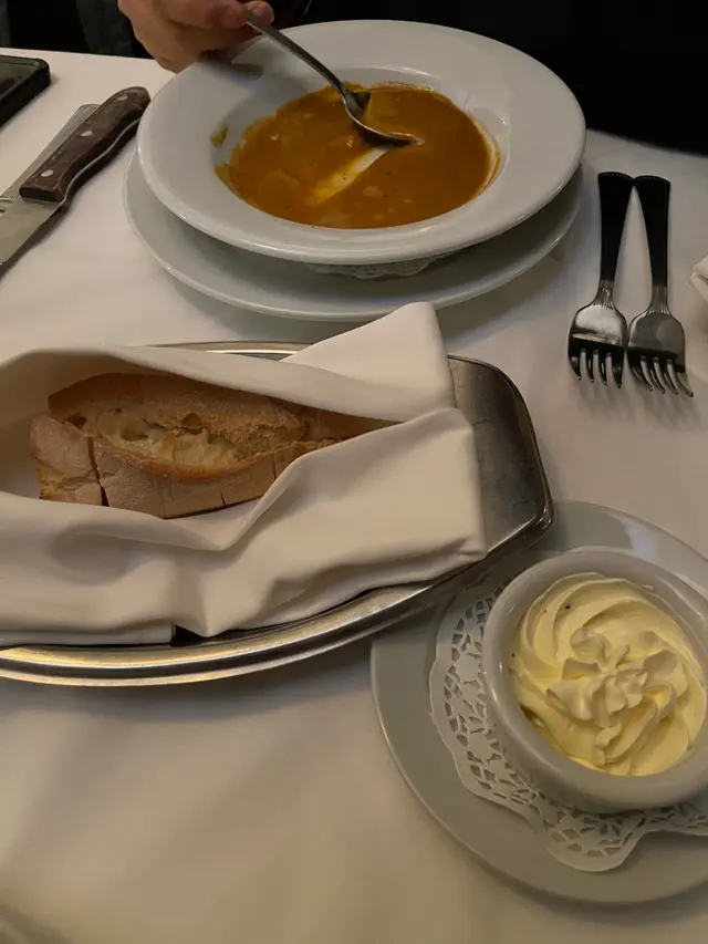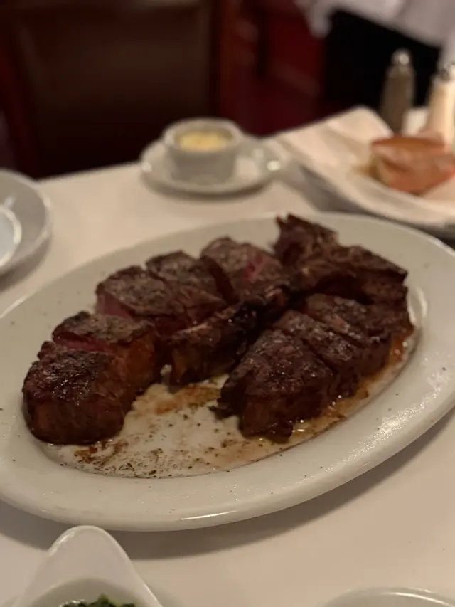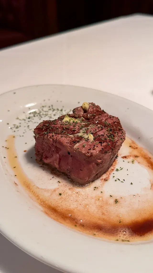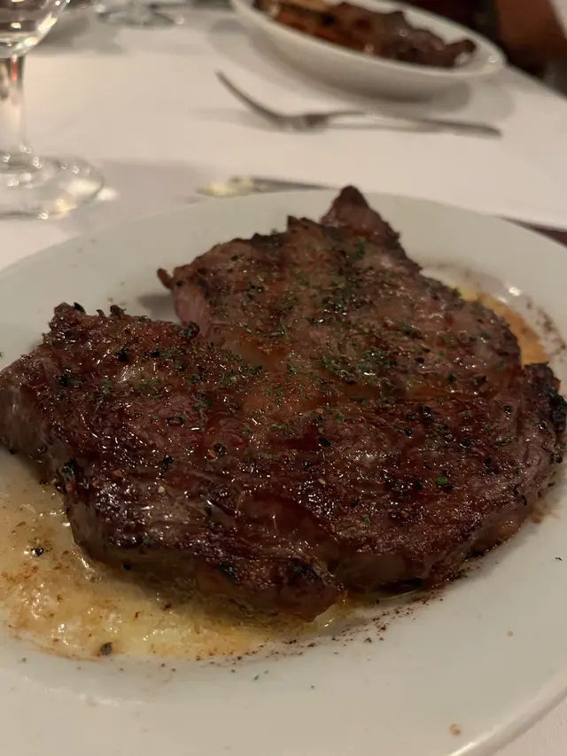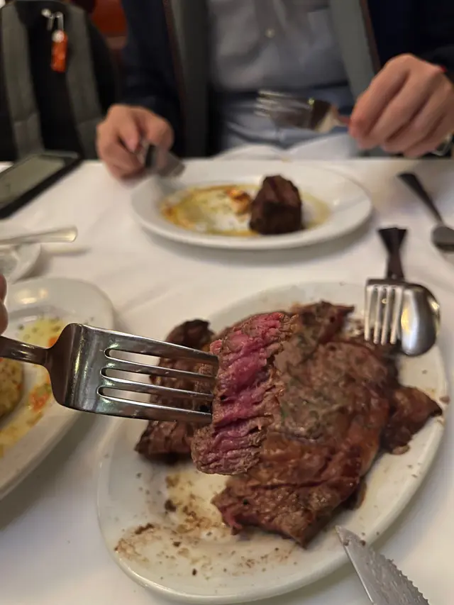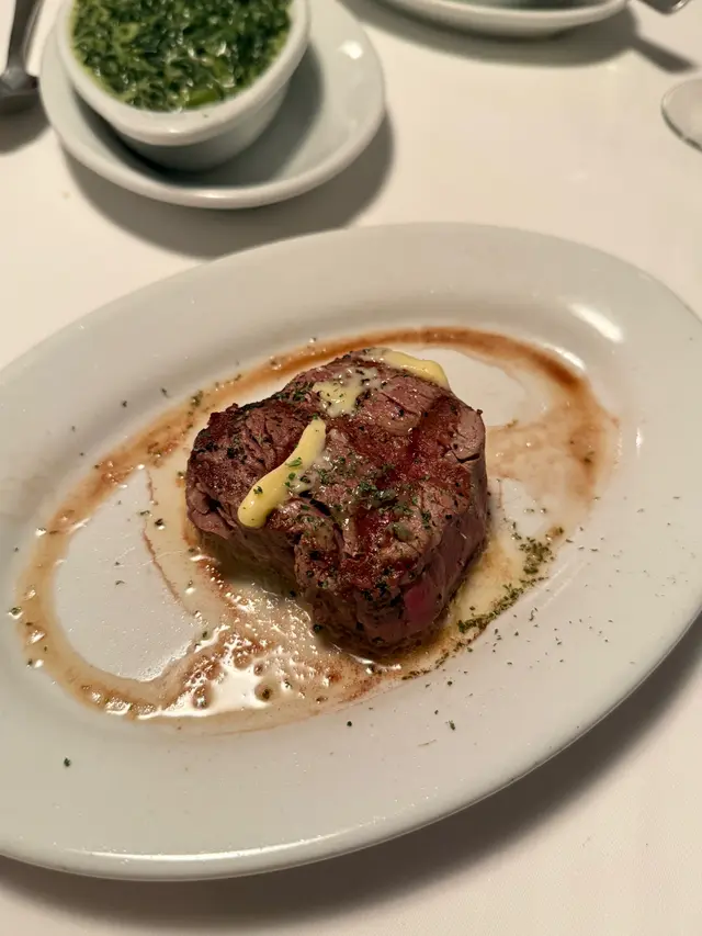 多年前光顧過,今次與友人聚舊再光顧。店內裝修依然貴麗,舒服,富懷舊氣氛。Lunch set 有六個選擇,叫咗六安士美國菲力牛扒及另外一杯紅酒。等左10-15分鐘左右,牛扒及紅酒一同送上餐枱,見牛扒外貌有啲特別,相機食先後,品嚐牛扒,依舊美味,十分滿意。紅酒亦有豐富熟香味道,絕配,亦有熱麵包。呢個午餐不錯🔹不過牛扒上枱時,有啲特別,不是一塊,而是兩塊🤔?是否chef 贈送?抑或先前唔夠六安士重量,後加?又抑或烹調期間,chef 切開睇吓熟未?無論點都好,呢個賣相,跟快餐店差唔多。所以希望餐廳高層留意一下。…查看更多
