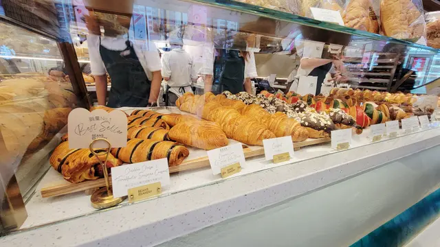 經過這間店,被一排弧形透明玻璃櫃內的面包吸引。款式很多,不知選那一款好。店旁有一款流心面包推介,南洋椰香咖哩粒粒牛舌酥,圖片太吸引,於是選了這個,然後再要了一個桂圓核桃酸種包。每個包都個别包裝,圓形的那個店員會問你是否要切開。開開心心帶回家品嚐,桂圓核桃拿上手分量十足。按袋上翻熱方法加熱了,口感厚實,面包好內有桂圓肉粒和核桃粒,不太甜,味道不錯。最期待個酥,翻熱後切開一看,大失所望,流心在那?只有肉粒滿滿却一點流心也沒有。幸好酥餅的口感軟熟,牛油和咖哩香味濃厚,一層一層酥皮帶少少脆口。不是不好吃,只是圖片太誤導。…查看更多