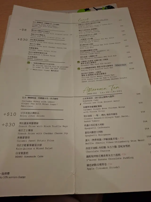 早1日訂位,平日夜晚嚟到,設90分鐘用餐時間。餐廳似逆市奇葩,平日仍持續有人排隊,不過幸好餐廳夠大,最後,我同朋友都可以坐耐啲。餐牌上的主菜/飯/意粉都跟餐飲,但飲品選擇少,只有冷/熱檸蜜、咖啡或黑糖薑茶,其他飲品及餐湯可-$8,各式甜品則+$30。以湯、飯/意粉、特飲同甜品咁計,連加一~$250/位。另外,仲可以+$30選配小食。牛肝菌湯:上菜時以茶壼裝住,由侍應席前倒入一隻放咗2小瓣牛肝菌的闊口茶杯;份量唔少;湯色飽和度高,入口亦濃稠,雖然頂多只係以蘑菇製成,但味道唔錯,鹹味適中龍蝦海鮮濃湯:上菜時冇牛肝菌湯的花臣;湯入面有海鮮料,如蜆;朋友話味道可以但冇乜特別羽衣甘藍藜麥雜菜沙律:+$30換的小食,份量竟然有啲睇頭,唔孤寒;配酸甜柚子蜜,開胃焦糖蕃薯條:+$30換的小食,份量大,滿滿的一桶;蕃薯條色澤金黃,入口香脆,表面淋咗蜜糖(但冇焦香),香口、好食,不過,餐廳竟然跟埋個蕃茄醬,配搭非常古怪荳子超級食物沙律:唔平,冇跟餐飲,唔抵食;顧名思義,食材係人所共知的各款超級食物,純素;沙律菜幾新鮮,牛油果略熟,味道尚算軟滑但已呈輕微瘀黑,藜麥、穀物的份量唔多,feta cheese正常,青蘋果、腰果只係點綴;全碟最好食係紫洋蔥,生食、好甜;沙律唔細份,但食飽就講唔上(飽肚的殼類太少)美式手打牛肉漢堡:幾個朋友share嚟;$170+只係咁真係幾令人失望;朋友冇話唔好食,我就試咗薯蓉同沙律菜,正常;個漢堡包好細,配菜佔咗隻碟的3/5,性價比低西班牙海鮮飯:同樣係朋友食,賣相可以,但飯量少,雖然如此,朋友都食剩1/4,話唔算好食千島醬海鮮薄餅:以為餐廳賣麵包,pizza應該好耍家,但當見到係厚批時真係好失望(個人喜好問題);薄餅的用料唔多,賣相麻麻,蘑菇片明顯係罐頭直出再放上餅面,焗製亦唔到位,焗完啲蘑菇仲帶濕,而且颜色蒼白,不過,薄餅單價唔高,如果想點樣嘢食飽個肚,可考慮Tiramisu:同朋友點咗4款甜品,呢款最好食;朋友本身唔想點,話太細杯,的確係,幾個人分,每人1匙;質感軟滑,有酒香特濃開心果杏仁蛋糕:喺餐廳門口見到凍櫃display,朋友已經話必食;送到上檯,覺得佢勁迷你;味道方面,1個字:伏!蛋糕唔好食,冇開心果味,開心果碎「淋」曬;未食過咁差的開心果甜品美式特濃朱古力軟心蛋糕:大件夾抵食,尺寸大到嚇一跳,1-2個人唔太建議點,3-4人就好適合;有香濃朱古力味(未到「特濃」),朱古力忌廉同朱古力海棉蛋糕層層相夾,食完會「漏」但滿足到想食甜品的慾望卷。奧樂蜜C蜜糖檸檬:擺盤有心思,蜜糖伴碟,味道香甜;卷蛋入面的檸檬味忌廉同檸檬果凍令層次豐富咗,同時亦中和到蜜糖的甜味,值得一試f熱鮮奶拿鐵:好飲,雖然一杯的份量唔多,但咖啡味香濃亦有奶香(加$3轉十字鮮奶),不過,呢啲都關乎咖啡師的手勢,因為喺Beans將軍澳分店都飲過淡而無味的咖啡食完就明點解餐廳可以逆市吸客:(1)環境:枱與枱之間有啲距離,座位舒適,餐廳溫度適中,坐得舒服;(2)服務:侍應的服務態度非常好,有求必應、冇甩漏,部分侍應好年輕,態度亦好,動作勤快,每次飲完水時,侍應會主動斟水,亦好頻繁地清碟;(3)食物:但凡加錢的食物、飲品水準唔錯,份量唔細,哪怕只係小食,賣相都令人impressed,不過,主菜係有啲「搶錢」。如果2個人嚟,不妨點1個餐,然後加餐湯、小食、甜品,轉特飲,再單點多1杯飲品同甜品,計落~$160/位,性價比高啲。…查看更多