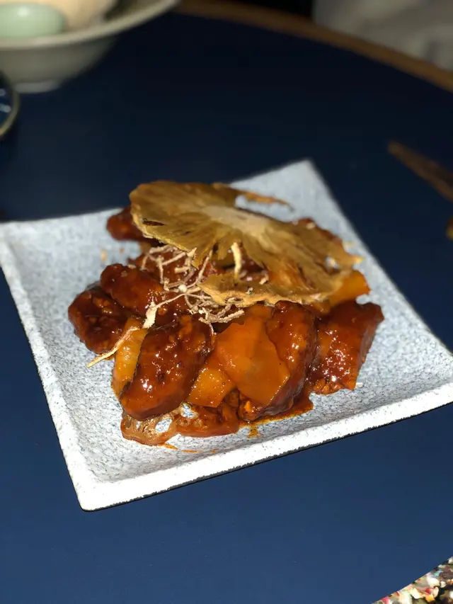 乌龙桂花茶熏脆皮鸡一打开盖,意想不到的花香茶味浓浓渗出,鸡件嫩滑全去骨,外皮脆薄,值得一试。黑砖豆腐外层竹炭粉炸至脆口,炸蒜连同豆腐一同入口,一脆一滑感觉很特别。澳洲和牛义烧首次尝试非猪肉制的义烧,和牛肉味浓,质感跟义烧一样有惊喜😋膏蟹银丝煲粉丝沾满了蟹皇味,只是稍微干了一点点昆布椰皇炖鲍鱼用料充足味道浓,真想多吃几碗滋补养颜餐厅以昏暗灯光为主调,全店装修型格厕所更是特色位之一,与朋友欢聚确是一流之选。实至名归的惊喜Fusion菜😋