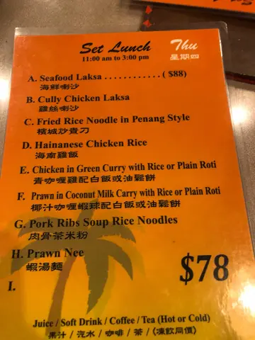 几年前已经喺呢间餐厅嘅忠实粉丝,最近同事同我讲,佢10月8号湾仔分店就会关闭,呢排就食咗几次,一次过同大家介绍,希望大家系关闭之前都食翻一次两次,因为真系好好味!午餐其实有好多款可以拣,每一款真系好好味㗎!$78 再另外+1,咁嘅质素好抵!海南鸡饭 $78个饭唔会太油,但有浸浸香味,啲鸡好滑,不过啲皮好肥所以我会唔食啲皮,但啲鸡真系好正,果酱好特别!青咖喱鸡配油松饼 $78同事推荐我食个松饼,好松软好好味!依家见到都好想再食返,重点系唔会太油,个鸡都好滑好入味肉骨茶米线 $78系openrice见到佢话系蔡澜推荐,果然名不虚传,感觉冇用到味精,个味好浓,我系饮晒成碗汤,啲米线就正正常常,啲料超好味!推!海鲜喇沙米线 $88我钟意个肉骨茶,朋友就钟意呢个海鲜喇沙,佢觉得个喇沙味好入味,唔太咸仲要有浸海鲜味,佢系我食到一半𠮶时已经食晒一碗!嘢饮就通常叫冻拉茶同拉啡,两杯都唔会太甜,食完咁好味嘅饭就有个好好味嘅饮,好爽!好得意嘅佢仲会送两粒日式和果子做饭后甜品,好可爱啊!总括依然系一间好好味嘅餐厅,好可惜佢10月8号就系最后一日,我谂我都会食咗一两次嘅