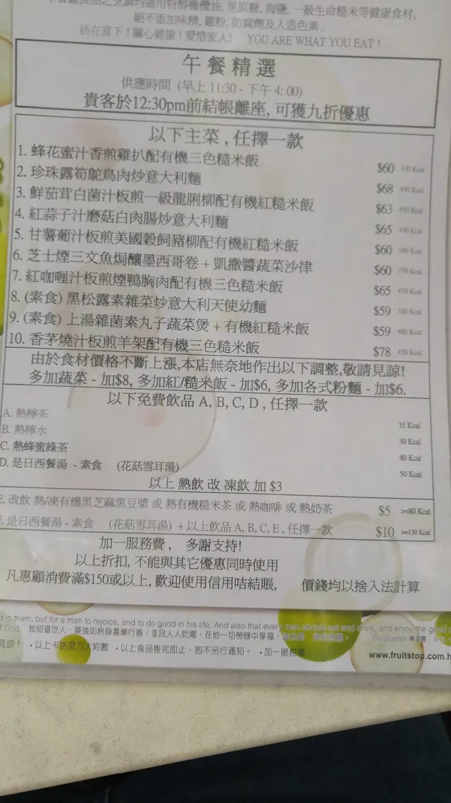 最近吃過太多豐富而油膩的晚餐, 今天下午想取個平衢, 本想去吃個少油的素菜午餐, 但同事正好想去中港城, 這個時候當然跟同事說, 不如去"菓一道". 由公司走去中港城, 腳程接近15分鐘, 到門外時周圍等待的已有10人左右. 但大約等了5分鐘左右便能入座, LUCKY. 這裡的餐單, 由意粉/天使麵/烏冬至糙米飯均可選擇, 另外這裡的午餐平均有2-3個"素食之選", 方便素食人仕, 非常貼心. 朋友點的漢堡配上半碟沙律 (還有送湯), 連一向食量不少的同事也有點吃驚. 同事說蔬菜上頗新鮮且漢堡味道不錯. 這個湯是素湯, 但用的材料本身已含有甜味, 喝起來清甜不膩口, 每次來這裡, 我都只會選湯而不選冷熱飲品.  接著我的午餐來了, 糙米飯上有放3-4塊鴨胸, 底層有不少蔬菜, 上面有咖喱汁. 賣相上有點不及漢堡餐. 咖喱的味道較簡單, 有點像葡汁.  低卡路里的鴨胸肉, 沒有看到帶皮的部份, 減少了主要油份. 肉不會太乾, 尚有肉汁, 與咖喱相配時味道結合得不錯, 蔬菜款款爽脆, 火候控制不錯. 配上糙米飯實在是健康智選. 裡頭的蔬菜份量並不少, 但下次我會選擇加蔬菜 (+$8). 同事點的天使麵, 看到我興趣甚高便請我吃一口. 麵的硬度適中, 捲上义子沒絲毫難度, 捲起放入口中, 菠菜茸緊扣著天使麵, 菠菜茸的甜非常清新, 吃起來比我點的糙米飯更好吃.每人大約$70的價格有一頓美味健康午餐. 沒投訴!翻食指數: 80 分.  價格合理, 食物美味, 最重要是補充日常攝取不足的蔬菜. (此指數平衡店舖交通, 味道, 環境, 價格... 等等, 個人作出的評價.)查看更多