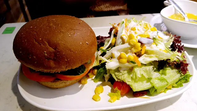 今天通過九龍公園的天穚來到中港城。時間是十一時左右,已過了早餐時段。就在猶豫之際,看到這餐廳門前的餐牌,有很多款式。而且在12:30前結賬,可享九折,於是入內就座。點了雞肉漢堡配沙律餐,靜心等待今天的早午餐。大大件的全麥漢堡包,夾著雞肉扒。雞漢堡肉扒,其實是冬菇肉餅/梅菜肉餅的中式蒸肉餅,住家飯常常出現的菜色。現在化作漢堡扒,與西式的全麥漢堡包殼。中西合壁了。雞肉漢堡扒混有黑色點點,可能是冬菇碎,但冬菇味道不太明顯,只感到剁碎的雞肉很滑,跟一般餐廳遇到的蒸肉餅口感很相似。漢堡包呎寸真的很大,嚐過漢堡包後,已有8成飽。還有份量十足的沙律,几經努力,還有剩餘的沙律。這早雞肉漢堡午餐,真的很飽!查看更多