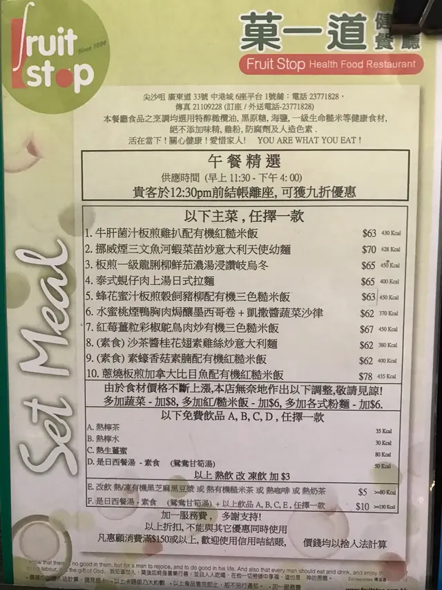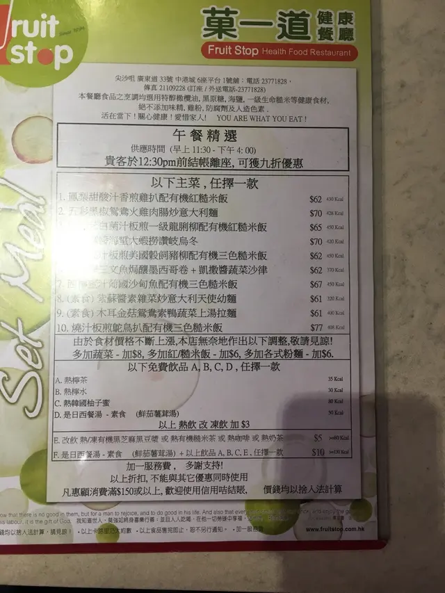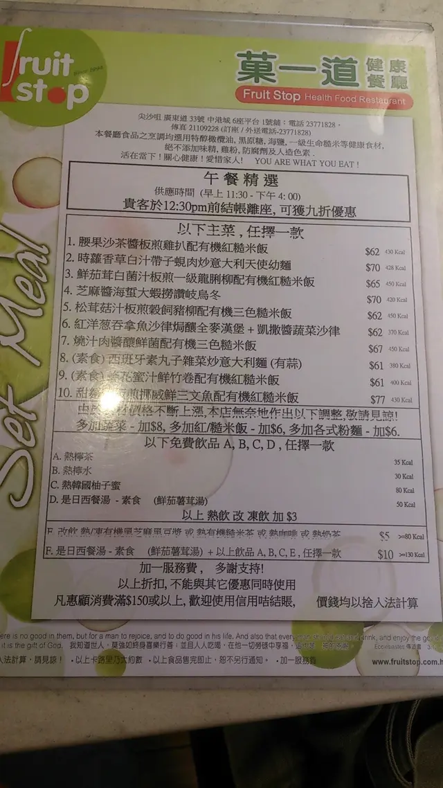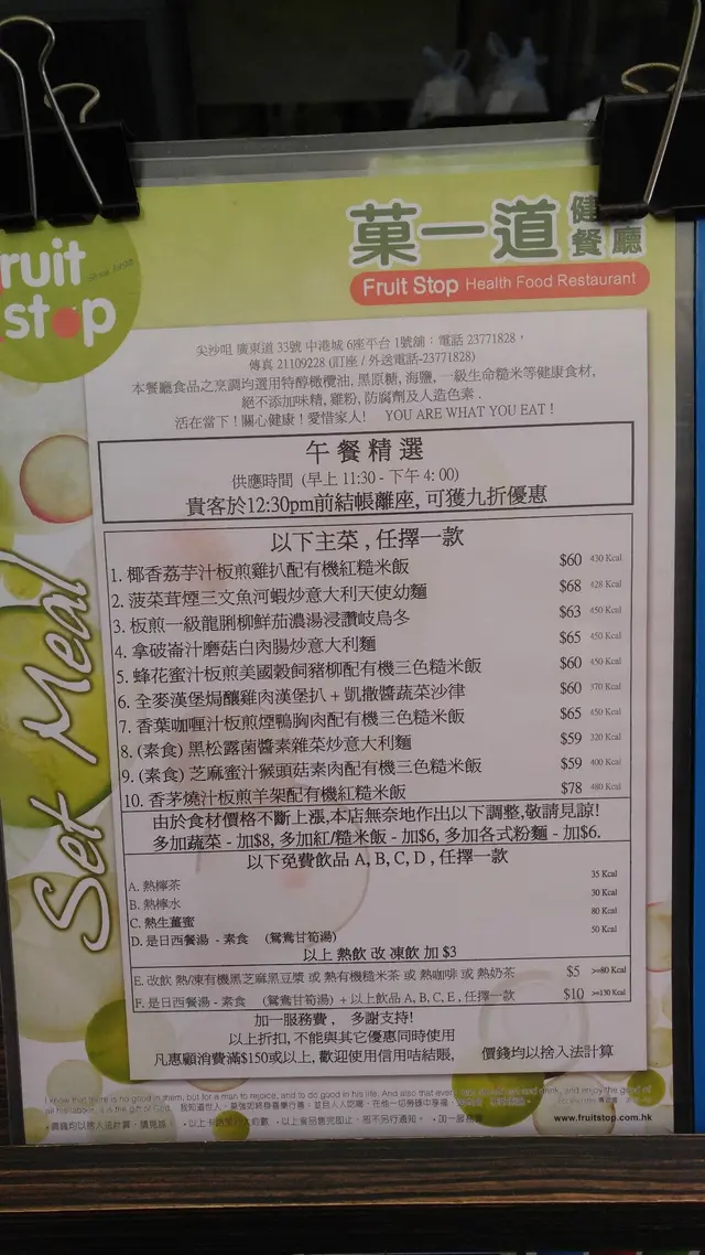 菓一道健康餐廳系由朋友介紹得知呢間餐廳,當時未搬到中港城就開始幫襯啦,依家響公司樓下,所以周不時都會過來食,當時每食一次就一個印花,儲夠10個就有張VIP卡,堂食免加一,拎走有9折,不過12點半前埋單都有9折,健康又划算。唔好以為健康餐D味道就差D,其實色香味俱全,而且唔會覺得有味精,每個餐都有好多菜,好適合食肉食齊嘅朋友一齊食飯。琴日幾個同事又去食啦,餐廳經常換,所以經常食都唔會悶。有個同事點左蔥燒蜜汁板煎鯖花魚柳配有機三色米飯,唸住會有腥味,試一試估唔到加左檸檬汁之後食起來更鮮。另外,不得不介紹佢果樽自製辣椒,唔食得辣嘅我,次次來襯都會加一小匙,佢D辣椒係辣中帶濃郁嘅香味,聞一聞都覺得好爽,更係我D食得辣嘅同事嘅至愛查看更多