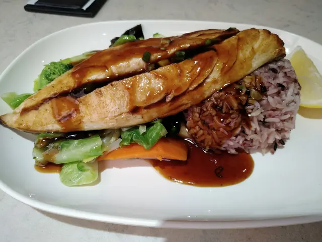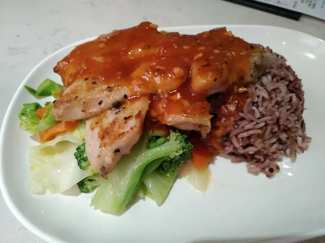 蔥燒蜜汁板煎鯖花魚柳配有機三色米飯