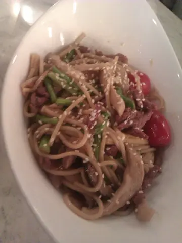 珍珠芦笋鸵鸟肉炒意大利面珍珠芦笋非常幼, 再将佢切开一小段方便食, 再加埋d紫洋葱, 菇, 鸵鸟丝去炒, 好香, 但又唔太油, 食到底果d系汁, 而唔系油, 而且意大利面软硬适中, 唔错~