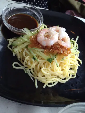 五彩大虾麻茸酱拉面五彩我只数到青瓜丝、海蜇、车厘茄、芝麻, 唔知大虾计唔计? 大虾都几爽口, 虽然冇乜虾味, 但个拉面就林咗少少~食果阵当然要捞匀食啦~ 但佢麻酱味唔重, 反而有少少酸酸地, 唔知加咗d咩呢? 果样就唔会觉漏~