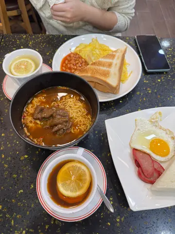 🍴 愉翠苑华峰餐厅食-!位于沙田愉翠苑街市的华峰餐厅,虽然环境属街市档口,地方不算好,但食物却有心制作,味道不差,展现出港式茶餐厅的日常魅力。🥢 早餐组合1Ommet 奄列 + 茄汁豆 + 牛油多士茄汁豆酸甜开胃,牛油多士香脆可口,奄列亦有心准备,整体味道不错。🍜早餐组合2沙嗲牛肉太阳旦红肠辛辣面沙嗲香浓,牛肉与红肠配搭丰富,太阳蛋令整碗面更吸引,味道不差;唯独面质较稔。🍋 饮品热柠茶、热柠水热柠茶茶味清香,柠水清爽解腻,简单却合拍,早餐搭配刚刚好。