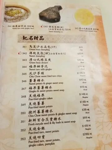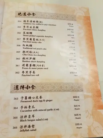 今日同一班同系潮洲人既朋友食晚饭,好耐冇食家乡美食,格外兴奋水瓜烙 ($98)- 烙系潮州食品既特色之一,有D似平时酒楼食到既煎薄罉,木薯粉+蛋浆做饼底,加上潮洲本身属食材丰富既地方,会加入蚝或水瓜等食材做主体,再加上葱、菜甫等香料,有烟韧既粉层、香料既口味衬托,同主食材水瓜本身既淡淡清香,系个好好既餐前薄饼,配搭鱼露,咸咸鲜鲜更惹味牛丸紫菜汤 (忘记价钱)- 友人极力推介必食之选的确系必食中既必食,牛丸一咬之下有爆浆,牛肉味同爆浆既冲击下,定格咗半秒,牛肉味非常特出,而且粒丸好弹牙,系我食过最好食既牛丸!鹅片拼鹅肠 - 鹅片OK,鹅肠肥美,卤水入味,有"口赵"口而唔会太韧,卤水味同鹅油脂既香混合出一种难以形容既人间美味豉油葱花煎普宁豆腐 - 都系第一次食咁简单口味既𩠌,果然豆味系香葱豉油下更突出。柠檬蒸乌头 - 潮洲人喜欢食鱼,甚至可以用鱼代替饭,将鱼蒸熟再摊冻,除咗方便,冻食反而更鲜甜同食到鱼香。虽然今次既乌头鲜甜度一般,但配埋普宁豆酱+辣酱,都别有另一风味酥炸虾枣 - 潮州𩠌中原汁原味既虾丸,用真·虾肉+爽口既马蹄打成丸,外层沾粉炸成金黄色脆皮,即炸即食系最好食糖醋面 - 将幼面煎成饼底形状,食既时候沾上醋同沙糖,喜欢甜酸口味既人一定LIKE成枱夹埋百几岁潮洲人,都系第一次听到有蚝爽哩味𩠌,好奇之下叫嚟试试,上枱后可能大家都食得七七八八,加上调味都系普通既姜葱蒜椒,而镬气唔算好强,并无惊喜,味度有点似一般酒楼食到既姜葱蚝,分别系哩个蚝爽细细粒,容易食。要凑米气既朋友最后都系要叫个最驰名既蚝仔粥,有方鱼有蚝仔,好丰富既饭食。难得大家开大个胃口,一定要食埋经典既潮食甜品福果芋泥 - 用芋头、猪油混和而成既邪恶美味,就连白果都系糖水浸既,钟意食甜既,又唔怕漏既一定唔可以错过姜薯系个潮州特产,口感似淮山既淀粉类食品,而煮熟后令糖水有独特既黏黏口感﹔而清心丸绿豆爽系粒粒绿头同少少啫喱既组合,两碗糖水味道系淡淡既甜味,清清地而口感唔同,可以话系平分秋色。成餐饭好满意,店员热情,朋友反而觉得佢太过热情,下次一定要再返嚟食牛丸同鹅肠。…查看更多