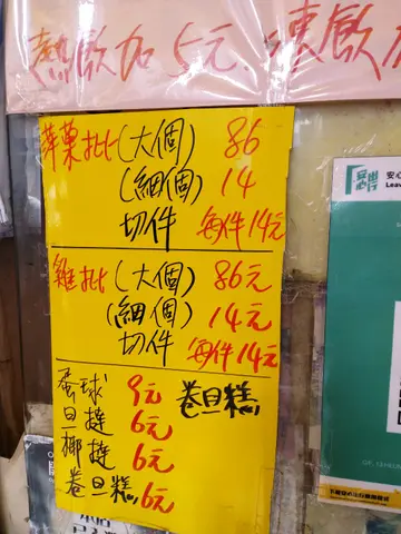 很久以前从朋友口中已听闻这店的鸡批不错呀!今天在大埔途经此店,终于有机会试这店的出品了。~鸡批原来这店的鸡批有分大和细size的;我估计大的应该馅料多些,适宜分享来吃,而小的应该较脆口,属一人份量。最后我选择了两个小的。鸡批皮有一定的厚度,而且脆口。馅料吃起来啖啖肉,还有我喜欢的洋葱。汁料份量适中,既不糊口又不会干沥。~沙翁因不是即时吃,所以吃的时候,沙翁外皮的沙糖已有点溶了,但又没有影响其味道。沙翁味道适中,完全不会过甜。这真材实料的沙翁炸得外脆内软,并不是空心的,好吃!…查看更多