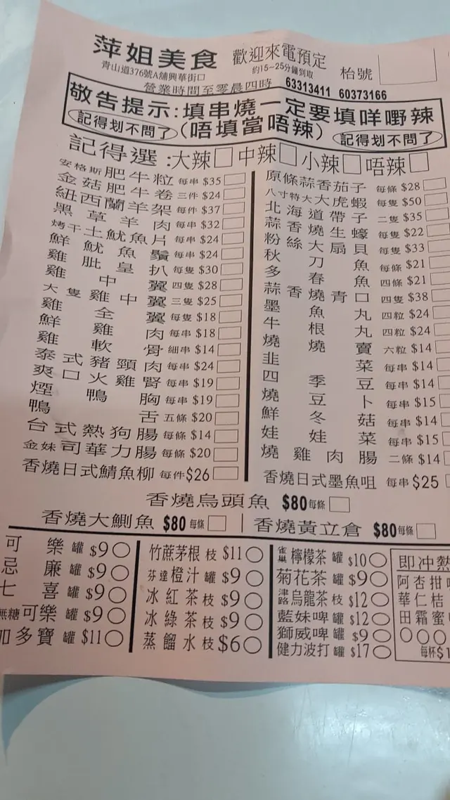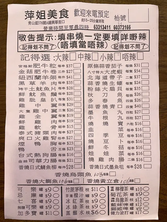 萍姐美食 (长沙湾) 网址: https://s.openrice.com/QrLS0Ffy000 地址: 香港長沙灣青山道380號和興大廈地舖 电话: +852 60373166