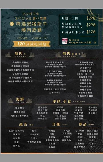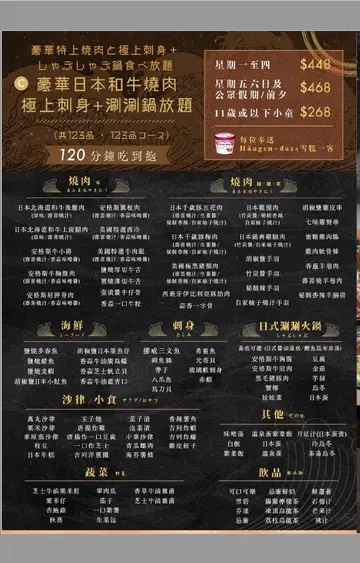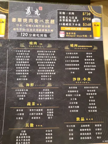铜锣湾有不少日本烧肉店,烧肉lunch set有唔少都唔错,不过通常都得一碟肉。今次第一次试万丸,原本以为都系set, 原来系放题,仲好啦可以食多几款唔同嘅肉同海鲜。去到首先觉得环境好舒适,background 播着日文歌,卡座座位十分阔落。点了几款牛肉,送到时其实我唔识分边款打边款,店员友善地简单介绍一下。食物质素好好,牛肉有不同酱汁的选择,我最钟意嘅反而系手羽同鸡肾串,很香口。最后仲有Häagen-Dazs 雪糕。价钱十分合理,星期一至四$178食90分钟(60分钟内落单),星期五$208。物超所值。因为烧肉需时,lunch可能两个人一枱比较好,否则食唔切😄…查看更多