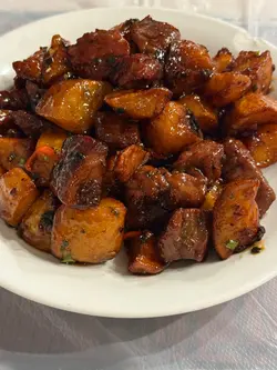 以前读大学𠮶阵,成日同成班宿舍同学嚟呢度食饭,贪佢抵食夹大件,气氛又热闹!今次特意翻嚟怀旧一下,叫咗两道经典小炒~🥔 薯仔牛柳粒 必点推荐!薯仔粒外皮炸到金黄香脆,咬落去外脆内软,薯香好出~牛柳粒份量超多,肉质软淋得嚟带嚼劲,黑椒酱汁浓郁但唔会过咸,捞饭真系一流!真心抵赞~🦑 椒盐鲜鱿 即叫即炸,热辣辣上枱!鲜鱿口感弹牙,粉浆厚度适中,椒盐香味够晒惹味~虽然无话超级惊艳,但绝对系稳阵之选,送啤酒一流!环境依然系咁热闹有镬气,上菜速度快~两个人食晒两道菜已经好饱。