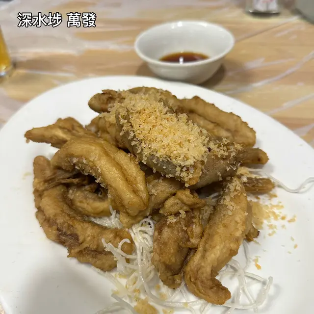 -一大班人食饭一定拣万发,仲要系九江街呢间,其实佢有几多个舖位依然系一个迷薯仔牛柳粒水准唔稳定,有时会得好少牛柳,同埋薯仔炸得唔够脆,不过中size都已经超大碟够八个人食,暂时未见到大size实物,食薯仔食到停唔到口🤤,jap爆卤水拼盘超大碟一定要叫,有我最钟意食嘅鱿鱼牛腱,椒盐鲜鱿份量都有好多,最重要系炸皮薄,通菜煲都好大煲、虽然价钱有啲唔抵生炒骨完全系over rate,完全冇谂过佢咬落真系脆,炸得好好食而家先知原来炸子鸡系叫做风沙鸡,都系一定要叫,炸皮薄得来香脆肉嫩,但唔系甘香皮爽海蜇手撕鸡可以唔使叫,手撕鸡得好少😖仲有啲咩系must need?🫡🫡-▶︎薯仔牛柳粒中size | $138▶︎卤水拼盘 | $168▶︎椒盐鲜鱿 | $138▶︎生炒骨 | $118▶︎金牌风沙鸡 | $138▶︎啫啫通菜煲 | $88▶︎海蜇手撕鸡 | $118-📌 -👅【万发海鲜菜馆】📍深水埗九江街150-152号地舖-