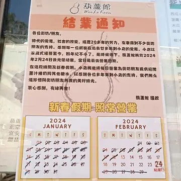 最近我去咗观塘葫芦馆,听讲佢哋之前有结业,但而家又有人接手继续做,真系好开心!呢间野既姜汁撞奶我由细食到大,所以就再去一试转手后,究竟有无变葫芦馆环境几舒服,设计简约又有啲怀旧感,坐落唔算太多,但算系干净企理转手后见到厨房系个女士负责,店员竟然系佢既女儿,女儿好乖,好有礼貌,好叻叻姜汁撞奶姜汁撞奶一上到桌,香味就扑面而来。奶味浓郁,配上姜汁的辣,口感真系好好,奶好滑,入口即化,而姜汁又带嚟一阵暖意,如果天气凉d就好适合暖身。虽然转左手,但质素一d都无变👍我特别钟意呢道甜品嘅平衡感,唔会太甜,仲可以感受到姜的香味,同埋我系食惯多姜少甜,咁就可再特出种姜味同奶味。最紧要系质素一样好,味道完全无变,真系好开心见到新主人继续保持咁好嘅水准💕🌟…查看更多