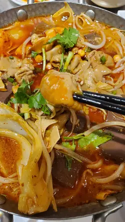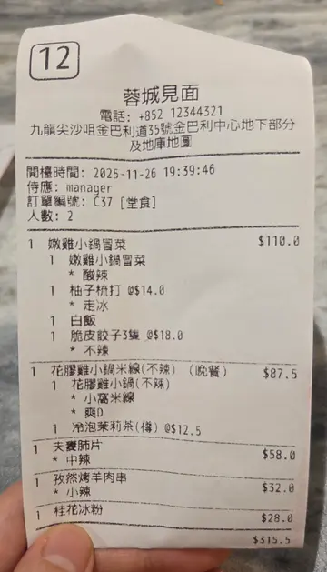 天气凉凉哋辣局也是时候翻生了!这天小试牛刀约了两位辣脚试新店来个小辣局。我们选到尖沙咀的蓉城见面!蓉城乃成都的别称吃的当然是香辣川菜。我们点了一客血旺肥肠小窝冒菜晚餐$88!套餐除了主菜之外还有白饭及饮品。饮品我选了青柠梳打原价$28跟套餐只需半价$14就可以享用到,酸甜爽口用来解辣非常不错。菜一端上来浓浓的香味扑鼻而来第一感觉相当不错。鸭血口感挺滑溜猪肠带有灵魂的味道,内里还有不金菇、莴荀等蔬菜好丰富,葱花的香花椒的麻及辣椒的辣充分融合在一起,如果猪肠能够大件少少口感更加丰满好吃。川北凉粉原价$28跟餐加$18!洁白的条状凉粉质感较为细软,配搭麻辣鲜味及醒胃醋香味道颇讨人欢喜。蒜泥白肉$58!蒜泥白肉可算是川菜中的入门美食,相信大部份人都有品尝过,但要做得好吃也不是简单的事!这儿的出品有齐爽、香、麻和辣多重口感特别醒胃。蓉城樟茶鸭$108/半只!我非常喜欢这道菜见到有当然要点来品尝一番,大厨挺有心思以青瓜伴碟带来不错的视觉效果。这只樟茶鸭带上幽幽的烟熏味道!但某些位置做得特别香脆少了多汁的咬口。蓉城麻辣鸡煲$168/半只!虽然只有半只鸡但份量非常之多,麻香味浓的酱汁超惹味鸡件熟度恰好够嫩滑,这个鸡煲我们也吃得非常满意。吃罢鸡煲之后我们点了两款火锅配料继续打边炉!分别点上午餐肉$28和莴笋片$22,两款也是麻辣火锅的好朋友当然好吃。甜品我们选了流心糍粑$28!成品非常香脆而且一点也不油腻,咬下去咔嚓一声非常清脆,内里是热腾腾的流心黑糖馅,以这甜蜜滋味令这顿晚餐圆满地结束。这顿每位只需$200我觉得性价比非常之高!喜欢吃川菜的朋友绝对可以去试试。…查看更多