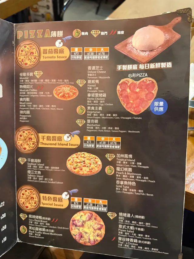 好开心聚会😁食住薄饼🍕意粉🍝鸡翼🍗饮住汽水🥤𣈱谈旅游心得😝交换旅行手信一流🤪🍕 怪兽多宝 (细) $73识食一定拣餐厅嘅招牌热门菜式😊我就最钟意多材料丰富嘅Pizza啦😍所以呢个啱晒我🥰配料有洋葱丶青椒丶辣肉肠、火腿丶蘑菇丶菠萝、牛肉同猪肉🤪Pizza 控表示好满意呢个Pizza😋因为标榜住手制饼底😉每日新鲜制造🤩仲要系心形pizza有心思😘🍝香蒜大虾炒意粉(无汁) $83冇谂过冇汁嘅意粉都可以整得咁好食🤤大虾鲜嫩加上美味香蒜酱汁😏再加上出色嘅蔬菜配料🫢例如青椒同粟米🤭仲有一些沙律菜🤠口感丰富😬🍗BBQ鸡翼 4只半份 $36鸡翼方面😀 鸡翼都有多款口味嘅选择😝今次我哋拣左BBQ鸡翼😉鸡翼整得有啲香脆🤩但系我就觉得BBQ酱汁略小😶如果BBQ酱汁多嘅话就够晒入味加惹味啦😎🥤忌廉汽水 跟餐 +$5夏日炎炎饮住汽水🥤食件薄饼🍕食一口意粉🍝同埋鸡翼👏绝配绝配🫶🧁🍰🎂切饼费每位$10餐厅都好欢迎大家带一些甜品糕点去餐厅进食 👍无论系蛋卷或者系小小嘅蛋糕仔🍰都系切饼费每位$10👍所以我觉得下次带个生日蛋糕同朋友庆祝生日也是唔错嘅选择哦✌️📍 薄饼怪兽 (新蒲岗)🔍新蒲岗仁爱街48号地舖…查看更多