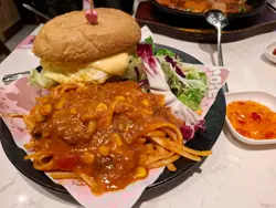 豬扒炒滑蛋豬仔包拼肉醬意粉