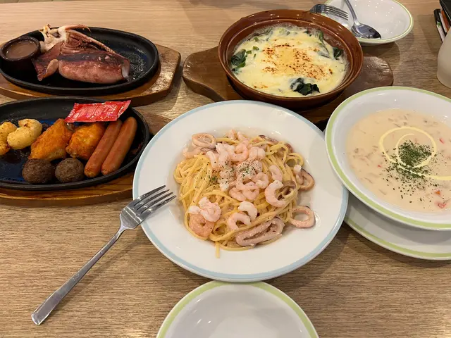~ 午餐.鐵板黑椒漢堡粟米辣腸雞球、明太子魷魚蝦仁意粉、脆脆蝦、蒜香法包、意大利松露朱古力雪糕、田園沙律配飲品吧~🍖 鐵板漢堡粟米辣腸雞球 👉🏼 黑椒漢堡扒厚道適中,內裡juicy,微辣,粟米微甜,煎到微燶好香脆配搭牛油好香,辣腸唔辣但外皮酥脆,雞球係麥樂雞味道。🍝 明太子魷魚蝦仁意粉 👉🏼 意粉Al Dente,明太子醬啱啱好掛住意粉,味道剛好不會過咸,魷魚同蝦仁比例少左啲。🍤 脆脆蝦 👉🏼 炸粉太厚但炸出嚟顏色很好,就咁食無味需要點附上嘅沙律汁。🍞 蒜香法包 👉🏼 蒜蓉牛油焗到好香,法包帶點微燶好脆。🍦意大利松露朱古力雪糕 👉🏼 標明中間係軟心牛奶雪榚但冰到好硬,同普通雪榚無分別。🥗 田園沙津 👉🏼 新鮮沙津菜,兩粒車釐茄花椒粉再加啲沙津汁,普普通通。🥤 飲品吧 👉🏼 一個價錢任斟所有飲品,但個杯好細,要不停出去斟。㊙️ 個人評價 👉🏼 非常平價平民意大利菜,對環境食物無乜要求可以試下💸 埋單免加一 👉🏼 $129🏡 地址 👉🏼 九龍灣牛頭角道77號淘大商場二期1樓F162-168號舖☕️ 一個人的餐桌 一個人的孤獨 請我飲杯咖啡 瀏覽下網誌 謝謝查看更多