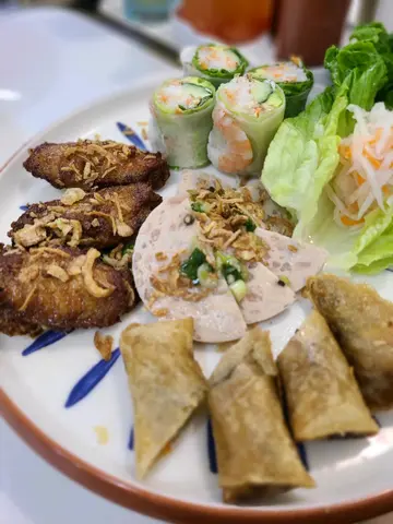 平日的晚上顾客不多,这家餐厅环境简约整洁。香茅牛肉滨海是一道越南风味的小吃,份量足够媲美主菜。香茅的清香与牛肉的鲜嫩,再加上花生和蒜片,配搭一团米粉一起食用。米粉没有调味,口感略为清淡。鹅肝酱三色扎肉法包外脆内软,配料丰富。三种不同的扎肉增加了口感,味道浓郁。虽然鹅肝酱的味道不太明显,但大量的芫荽和萝卜丝,使得每一口都充满惊喜。由于份量充足,吃的时候配料难免容易跌落。牛油蒜香鸡翼热辣辣上枱,忍不住立刻试吃。鸡翼肉质鲜嫩,香口惹味。清炒通菜份量很大,适合与朋友分享。…查看更多