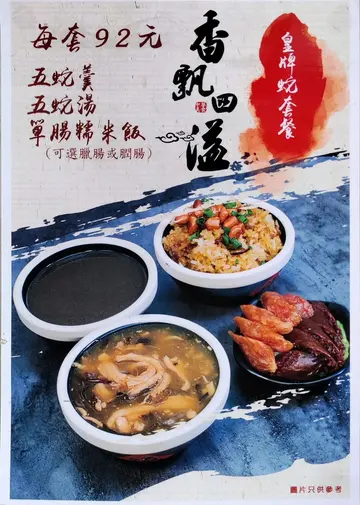 差唔多中午1点到,铺头唔大,大20个位,已经坐满人,自己一个嚟食,未试过呢间,叫个餐咩都有可以试到三样嘢,皇牌蛇套餐,有蛇羹、蛇汤同单肠糯米饭,$92蚊算平,全部都系屋企饭碗咁大嘅份量蛇汤有啲辣,辣味掩盖晒汤本身味道,只饮到有少少药材味,唔知仲有用啲咩材料煲糯米饭正正常常几够味,润肠好食,可惜成个碗都系漂白水味,食到底啲糯米饭都充满漂白水味,但又唔想浪费。夹硬食埋佢蛇羹蛇肉唔多,但木耳就好多,味道不过不失