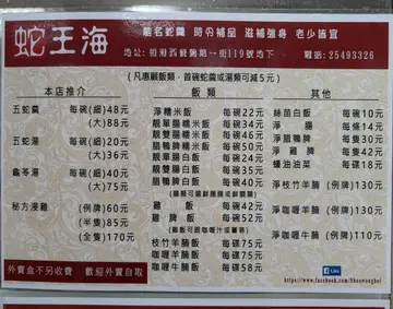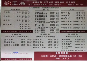 早几晚去了西环蛇王海处壹个人食蛇餐 。 这里的蛇餐年年都咁好食和抵食. 套餐$ 92 元免加壹 上年也是这个价钱 . 首先食个蛇𡙡 . 味道保持水准 再淡番少少更好 . 再食个膶肠糯米饭 这个刚好合一人份量 . 蛇汤后上食完前两样先上 免得冻了 老板娘也很好招呼 安排壹切 有板有眼 谈笑风生 道聴途说 有很多街坊帮衬 也有很多人从好远的地方专程到访帮衬. 我也是夸大海到访的已两年了 还有另外的炆羊腩炆牛腩小菜跟饭也不错他日也试吓 。 这是壹间提供秋冬补身的小店 . 不错的选择。
