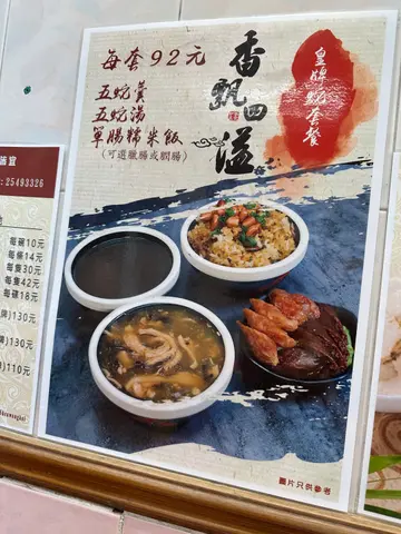天气越来越冻,所以夜晚训觉手冻脚冻好难训著,跟住朋友中午话带我去食好嘢,嗱嗱声跟住去皇牌蛇套餐:🐍五蛇羹:成个汤羹比较浓稠,唔系水汪汪裹种感觉,用料对得住佢既价钱比较用心。蛇肉分量都可以。🐍五蛇汤:蛇汤需要趁热饮用,有淡淡既药材味,中意饮药材汤既会觉得甘香顺口。我就比较喜欢呢种味道。🥚单肠糯米饭(可选腊肠或𥆧肠):我选择佐润肠,糯米饭香味扑鼻,油香软糯,润肠甘香。环境:店铺虽小,但胜在有人情味,感觉好多食客都系熟客同老板有讲有笑。