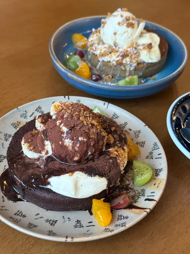 蟲二下午茶Cafe是個令人驚覺自己原來食量可以好驚人的異度空間。甜品確實令人失望,明明衝住"signature"先點落去諗住可以打橫躺平,但放在面前的完全唔係梳乎厘班戟,而係無火焰的火焰雪山加用酒浸泡完但無拎去煎的發涱麵包, 一點空氣感都沒有, 明明是麵包,不明白它哪一點是梳乎厘班戟, 味道還好, 有朱古力味和酒香, 不會太嗆, 是可以的, 但雪糕普通, 原味, 雲呢嗱味都吃不到, 沒怎麼加分, 而且加水果有點格格不入, 如果用的是朱古力雪糕味道會更濃郁。以118元來說, 份量少, 不夠飽, 材料又沒有很上乘, 味道亦沒有很好, 真是不建議點, 想吃的話可以試試另一間點, 這真的說不上是signature. 可能各人口味不同反而另一道麵包料理則超水準發揮。原本對佢無期望,因為薄切豬肉﹑玉子燒加酸種包本身就好難做得好食,但味道調得相當好,煎脆的厚切酸種包(這個居然有煎脆)加上甜甜辣辣的秘製醬,真係好好食。玉子燒不厚切都沒有切爛, 真心高技術, 但份量都日比較少, 只是輕食, 不夠飽, 收費都不便宜, 都要145元, 還要加一。而且沙律菜的味道有點不太新鮮, 但主體是很好吃的, 值得推介。結論是觀塘cafe有實力,又抵食。旺角cafe則精緻兼環境舒適。…查看更多