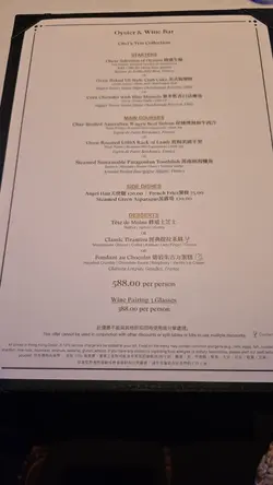好失望。由90年代一直喜欢到Sheraton Oyster.& Wine Bar 食饭及庆祝生日。因为有一年冇来,朋友为我庆祝生日,所以又专程来到用餐。见餐牌已经改左大部份菜色,念住有惊喜。首先,我点了有3个 courses 嘅餐($988)。前菜是冻西班牙红虾刺身; 就份量来讲,系小到惊人,只得一只细虾份量。念住前菜都算。但质素来讲系冇刺身感觉。主菜我叫左个煎焗羊架, 一出碟,我都有小小吓亲,只得一条骨细羊架🤣. 未食过fine dining 羊架系得一条细骨羊架。 其实我认为设计呢个3 courses menu 好有问题。一个细食嘅人都吾会饱或连5成饱都冇。点解主菜份量啱小,但又冇side dishes 比你加上去?原全有误导成份。如果佢嘅份量系啱小,menu 上系要加上几gram.第3个course 糸甜品,ok 冇问题的。我d朋友就叫左个Iberico Pork, Omg 肉质吾得,吾可以系5星洒店到食到。其次,我朋友订座时,已Remark 甜品上要加上Happy Birthday, xxx. 甜品出了,当然冇惊喜,就是碟上系冇 Happy Birthday 字样。我地准备埋单时就反应左冇Happy Birthday 字样,佢地解释就话睇漏左。不过事后就再补番个甜品加番个字样Happy Birthday 比你。今次完全觉得食物质素下降到一个极点,希望管理层可以睇到呢个评语。尽力挽回当初Shetaton 嘅质素。真系好失望!!