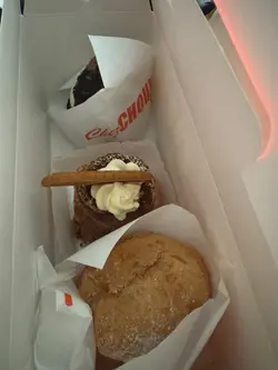 食饱米线,经过观塘港铁站,甜品瘾起,就觉得可以嗌个泡芙返屋企食吓。望住个橱柜,见到好多种类,花多眼乱,选择困难症又发作,都唔知拣边款好。见到出咗个新品,所以试吓。焦糖脆脆意大利芝士泡芙首先块饼系好食嘅,同平时𠮶啲一样味道。跟住食上面𠮶啲意大利芝士,系真系似Tiramisu嘅。最开心嘅系上面层cream食完之后,入边都仲有啲原味嘅cream。另外叫咗榛子朱古力布丁泡芙同埋原味特浓吉士比细佬同佢女朋友喺屋企食。