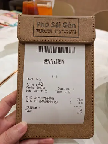 餐厅:西贡街头越南牛肉粉地点:湾仔克街菜式:越南菜餐牌:茶市套餐有传统捞檬,汤粉,法包,米饭,选择都唔少。另加一。可以用优惠价钱加小食。跟餐包基本热冻饮品,好多选择。亦有特饮升级优惠。生牛肉牛腩片汤粉 $62 另加一生牛肉牛腩片汤粉大大碗,生牛肉两大片,生住上枱,呈粉红色,食落非常粉嫩,唔会太薄,好有牛味。牛腩有5件,半肥瘦,真系超淋超好食!汤粉可选河粉,檬粉或者金边粉。我选左河粉,系幼身兼非常滑溜,其他配料有洋葱圈,葱花,同芽菜等,个汤味道都唔错。质素系几好。另配青柠同辣椒比你自己调味。可以用优惠价钱加小食。蒜蓉牛油鸡翼 加$28 另加一蒜蓉牛油鸡翼一客两件,炸得脆皮而肉嫩,牛油味适中,如果蒜蓉味浓d就更好。伴有酸腌红白萝卜丝,沙律菜同椰菜丝沙律解腻。跟餐包基本热冻饮品,好多选择。亦有特饮升级优惠。薄荷青柠梳打有好多薄荷叶,我叫左走甜,味道酸酸地,够解渴又健康。总括而言,今餐食物都唔错,特别钟意生牛肉牛腩片汤粉,价钱都唔算贵。餐厅环境光猛干净,座位舒服。…查看更多