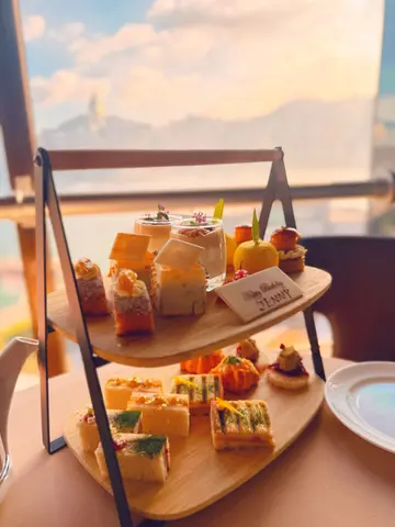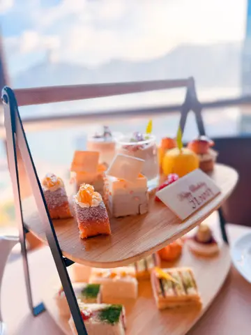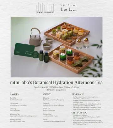 今次就试试同mtm crossover 既 “mtm labo萃润秋肌下午茶”今次系walk-in, 上到去见差唔多full哂, 窗口位都冇哂, 不过我坐个张枱都睇到景既👌🏻跟住大约15分钟后tea set就上枱啦~底层: 洋甘菊烟熏三文鱼青瓜三文治玉子三文治炒面面包人参鹅肝挞积雪草蟹肉牛油果沙律多士上层:开心果覆盆子慕丝蛋糕栗子伯爵茶慕丝杯枫糖胡桃朱古力挞金奇异果千层酥原味松饼抹茶巴斯克芝士蛋糕整体黎讲, 咸甜点正常发挥, 不过不失👌🏻特别d既话我就觉得 “人参鹅肝挞” : 面层好似cream brulee咁脆, 同埋有抹茶粉衬托