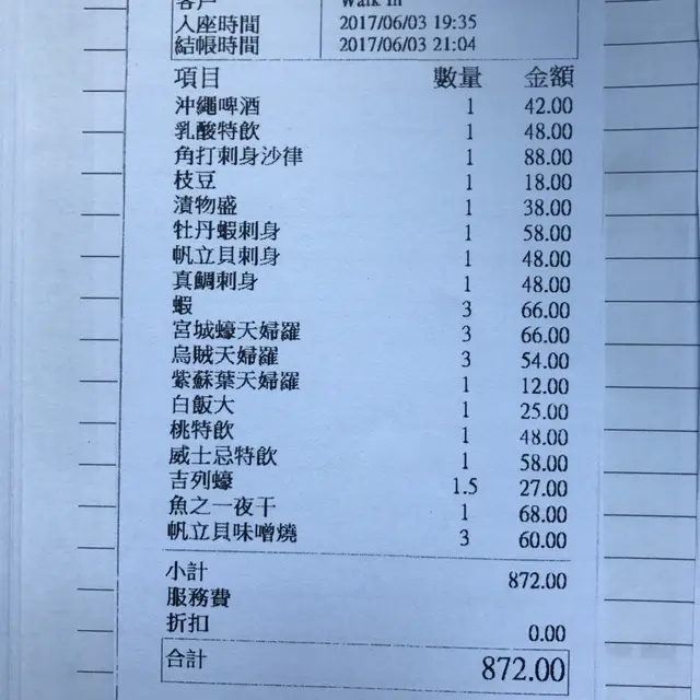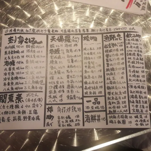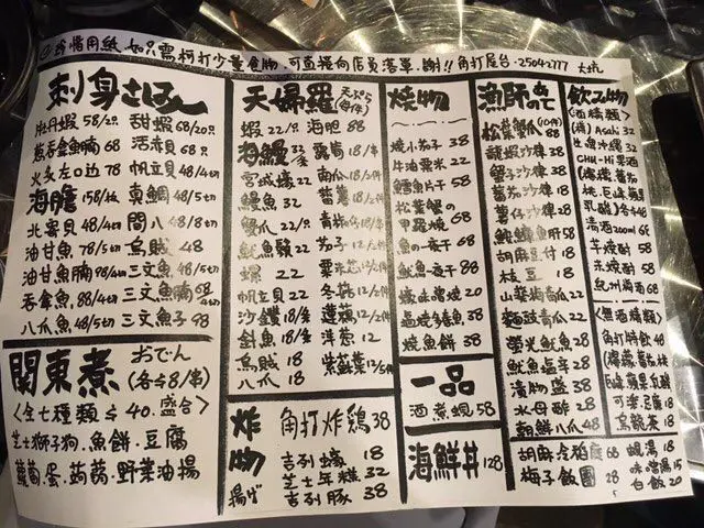 平時同男朋友都係喺銅鑼灣飲飲食食多,食到悶悶地諗住去大坑睇吓有乜食,之後上網搵到呢間日本居酒屋,環境好似唔錯,仲有好多好評,所以就專登去試一試,點知⋯⋯⋯真係10萬個失望⋯令我地第一次咁有恆心,一定要開個account 寫劣評。希望大家唔好再中伏。晚上7點左右,正值晚飯繁忙時間,我們一到達門口,見到環境確實幾似日本居酒屋,1秒都冇考慮就入去坐低。餐廳內只有一枱食客2個人,可見非常清幽!總共有三個職員,兩個在廚房內,一個女侍應。首先服務員不能說的服務態度差,因為他們跟本沒有提供任何服務。坐下就自己照顧自己,餐牌上其實食物選擇不算多,如果晚餐來的話,一定要order 大白飯。我們order 了三文魚、帆立貝刺生,海鰻、蝦天婦羅,龍蝦沙律,芥末燒蠔,牛之鍋加2杯生啤。帆立貝刺生可見職員刀法高明,感覺有點像一粒開4片,三文魚就不是很薄,但感覺不太新鮮,天婦羅以炸粉為主,口感很差,龍蝦沙律的份量,真的奇少,牛之鍋湯底極鹹,芥末燒蠔是全晚覺得味道不錯的唯一。結帳總數七百蚊左右。成個晚飯時間不足45分鐘,我哋就速速離開,出到門口男朋友就主動建議去食多碗雲吞麵或魚蛋粉。因為這一餐味道一般而份量更極為少。總結幾句,環境不錯,沒有服務態度,食物味道不佳,份量少!真心覺得浪費左餐廳的環境,希望老闆多多改善,不過我倆都決定永久不會再光顧!
