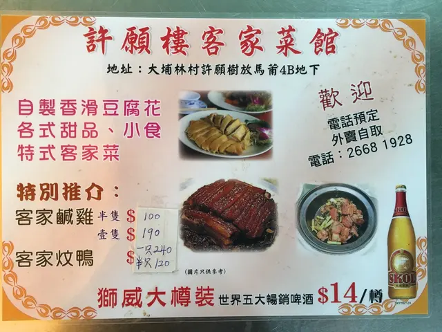 許願樓客家菜館早上,我與親戚到了元朗的俱樂部摘士多啤梨,遊玩過後,再與家人到了林村逛逛,大夥兒都覺得有點累了,所以便到了這家客家菜館坐下休息,作為一個中途休息站。這家林村客家菜館主力賣豆腐花,餐廳內不斷播着一段錄音「100%珍姐自家製豆腐花」,內容押韻又好笑,好吧,我們一於試一試珍姐100%自家製豆腐花!落單過後才發現這裏沒有凍豆腐花供應,不消一會兒,豆腐花便上枱了,豆腐花的質感非常細滑,略嫌豆味不夠香濃,不過配上黃糖後,清清甜甜的味道令人感到非常舒暢!查看更多