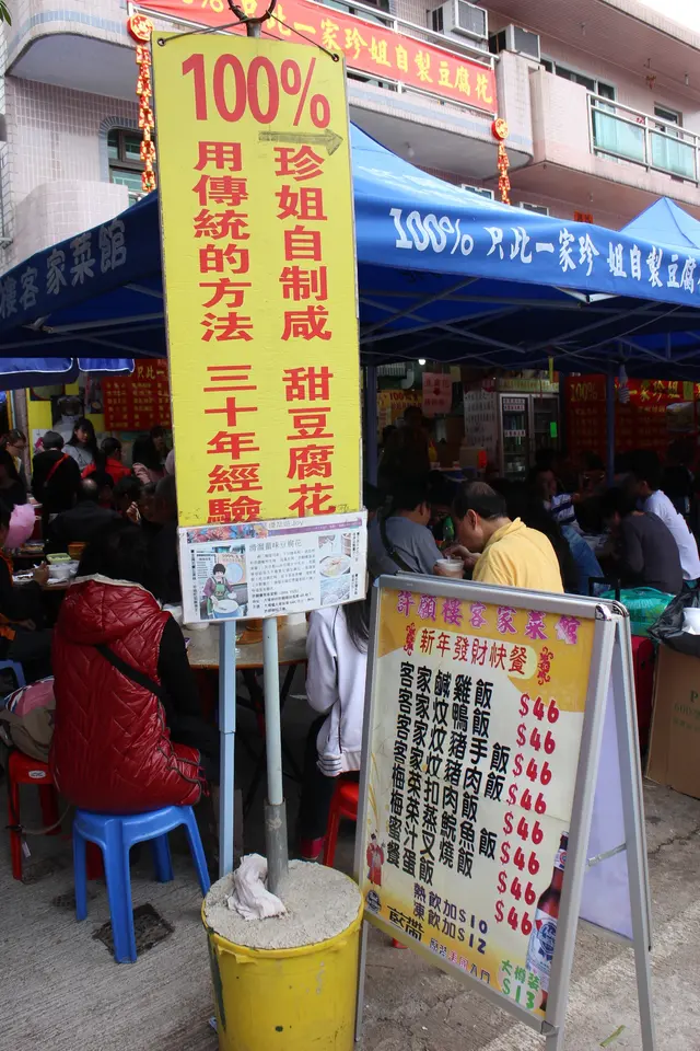 今年春節,平生第一次來到大埔林村許願樹,感受一下農曆新年裡香港鄉郊地方碩果僅存的熱鬧過年氣氛。雖然沒有許願,但饞嘴的我仍然不忘在許願樹近的這間「許願樓客家菜館」裡品嚐這裡的「100%珍姐自製豆腐花」,這兒的豆腐花沒有因為春節而乘機加價,仍如平日一樣 $10一碗,不過就要顧客自己在賣豆腐花的地方付款後自行拿到座位中吃。這兒的豆腐花是沒有凍的,只有熱豆腐花,不過豆腐花也不是真的很熱,只是溫溫暖暖的,下點黃糖,再加點下了多塊薑片的糖水,舀進口中,豆腐花的感覺甚為滑溜,但味道則稍淡,豆香無疑是有的,但不是太濃,而且薑糖水的薑味也比想像中淡,一樣不是太濃,要下多些才能感覺得到。這「100%珍姐自製豆腐花」雖然有不少宣傳標語和易拉架大肆提到是只此一家的出品,100%由珍姐自製,以示與附近的兩間店舖售賣的豆腐花有別,而且也有不少顧客如我者被吸引來幫襯,但豆腐花的質素未算得上很好,就這次所試的感覺,假如要為豆腐花打個分數的話,這豆腐花是及格的,但要說它的分數很高,就未可以拿到了,就六十多分吧。查看更多