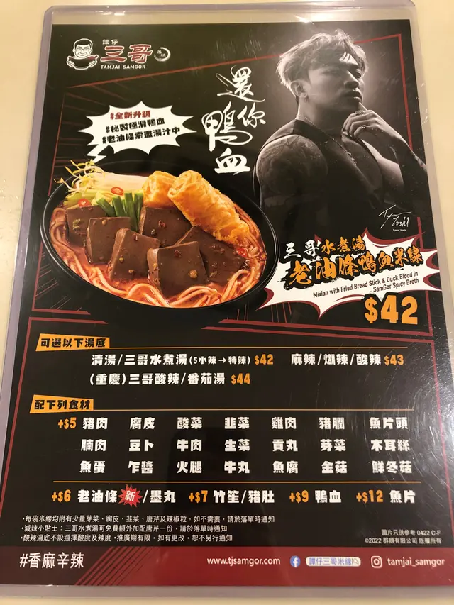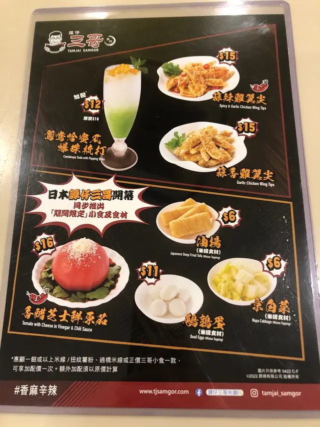 三哥還大家鴨血啦😘 仲要一口氣出左勁多新款米線、新小食、新飲品、新食材!作為忠粉既小編梗係要試晒去啦🥰🍜 三哥老油條水煮湯鴨血米線唔好睇少三哥既水煮湯底😆 小編自認平時都幾食得辣,今次叫左小辣,食到最後都流晒鼻水🤣配料目測有成6塊厚身既鴨血😱 呢個價錢絕對唔貴!芹菜可以解辣,所以都有少量芹菜做配菜😋😋😋最後就係小編最期待既老油條,有兩件,試左一啖冇浸湯既,超脆口🤩 另一啖就淋落個湯度浸到淋晒,吸晒啲水煮湯既辣,超正🤩🤩🤩🐤 蒜香雞翼尖雞翼尖好爽口彈牙😱 啲蒜泥連埋芝麻油既香味,食到上癮🤤🐤 蒜辣雞翼尖呢個小編更愛,比我想像中辣呢😝 一樣都有濃濃既蒜香!重口味人士注意!🍈 鴛鴦哈密瓜爆珠梳打濃濃既密瓜味梳打😋 夏天飲真係岩晒!仲有香茅汁及檸檬汁調配而成,夠晒清爽🤩小編最中意係加埋爆爆珠😆 係口中爆個刻真係好正!🍅 香醋芝士鮮原茄呢個配搭小編都係第一次食咋😳香醋醬汁加番茄加芝士估唔到咁開胃!落單個時個姐姐仲話我地「識食」呀😝🍜 自選米線(油揚、京白菜、鵪鶉蛋)揀左個麻辣十小湯底,清清地,同啲全新既配菜好夾呀😚日本油揚好索湯👅👅京白菜都幾爽甜😚 份量都幾多😚 健康😛鵪鶉蛋有5粒,超彈牙😋好似係期間限定,大家想試就要快啲試啦!查看更多