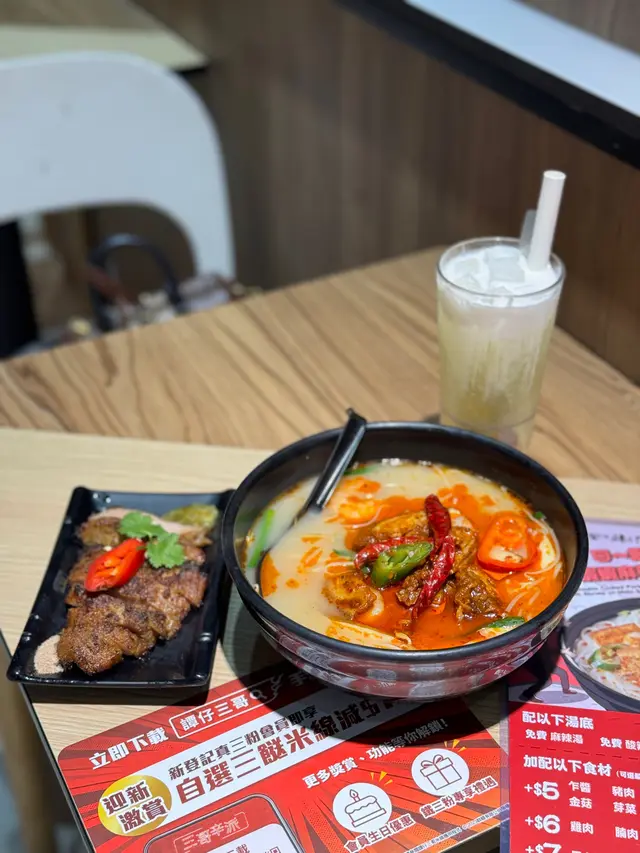 呢間三哥係我同仔仔同學仔媽咪們最愛下午茶超平而且仲可以儲分換現金券或者食物同埋佢下午茶比較少人食等嘅時間相對冇咁耐過小橋米線👍🏼👍🏼👍🏼過小橋米線入面大概有12樣餸我當日揀咗砂砂湯真係好鍾意佢呢個湯底有種喇沙嘅香氣但又唔係特別濃而且下午茶份量都算好多土匪雞翼5隻佢嘅土匪雞翼都係我最愛之一雞翼唔會焗到乾晒孜然粉加埋芝麻嘅味真係好香口燒豬頸肉👍🏼👍🏼👍🏼仔仔每次都好鍾意呢個餸佢個豬頸肉爽嫩多汁仲有佢個酸辣汁好惹味爽口青瓜唔會太辣調味好好而且係免費㗎早排做出特價有得100分換一個杯麵而且食夠指定次數嘅下午茶仲會再送小食咁着數仲唔快啲去食🤣🤣🤣…查看更多