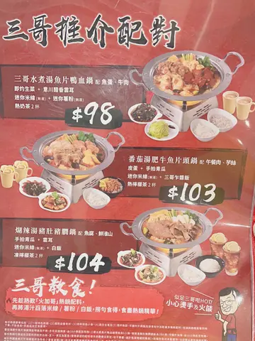 谭仔三哥米线相信大家都好熟识最近新出既热锅你地又试过未呢~火加哥热锅有3个味分别系水煮鱼片鸭血锅、蕃茄汤肥牛鱼片头锅同今次我就简左蕃茄汤底三哥既番茄汤底一向都系我至爱热锅系2人用套餐 总共$98每个本身有京白菜、豆卜、青瓜、云耳、唐芹同芫茜材料都几丰富套餐亦都包括1款2𩠌特色热锅+2款自选𩠌(total4𩠌)+2款特色小食+2份主食同2杯热饮𩠌方面我推荐鸭血同午餐肉!!加落蕃茄汤系劲夹!其他𩠌我就拣左响铃同墨丸主食就米线同+$5既乍酱饭米线本身已经煮熟左 可以将热锅既汤淋系米线或者饭上面一齐食乍酱捞饭都唔错 可惜乍酱得好少而且个饭偏干同硬其他就同平时食开既米线冇咩分别我地仲+$6升级特饮打边炉就系要饮冻野先爽!另外个火要15分钟就换一换燃料,见D员工要系咁换火都邓佢地辛苦整体泥讲系几得意既但套餐限制左加𩠌数量如果可以加多几款𩠌就更加有打边炉既feel啦~
